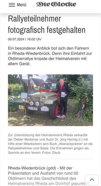 'Die Glocke' berichtet über die Aktion zugunsten des Heimatvereins Rheda anlässlich der Oldtimerveranstaltung am 07. Juli 2024